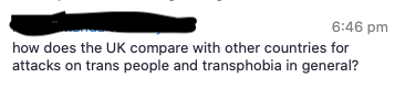 Trans people are the most likely to get murdered and commit suicide, especially black trans women of colour [i.e. black men]. The waiting list just to get seen in a gender clinic is between 2-4 years. Once there, the doctors are often frightening.