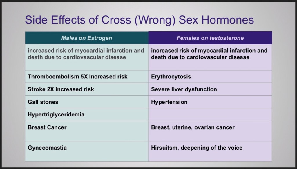 Now here’s something I never considered. When do you restart testosterone after giving birth? Well if you have had a ‘genital birth’ the wait time is only 6-8 weeks. If you had caesarian it’s 3-4 weeks because ‘testosterone does promote the promotion of red blood cells which can help heal a surgical wound’. Trystan says ‘there’s reason to believe that testosterone may help you heal better from a caesarian wound’ and then tellingly shrugs, rolls her eyes, and says ‘this is just based on what we know about the body’ and giggles. Then she pulls a serious face and qualifies her statement with ‘but there are no specific studies on this’. Of course there aren’t, it’s gobbledegook.