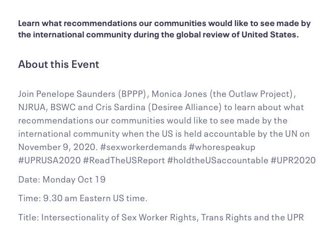 They were discussing the USA’s upcoming Universal Periodic Review (UPR) to be conducted by the United Nations, due on 9 November 2020. You can read more about the Universal Periodic Review here. UPRs take place once every 5 years, according to Saunders, and they were hoping their recommendations about sex workers and trans rights would be heard, and had been working on it for about 18 months.