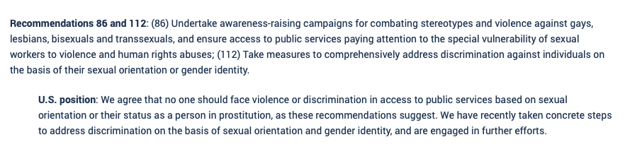 Here is a link to the recommendations that the United States accepted at its last UPR. Below is a screenshoot of recommendation 86, note that it refers to ‘transsexuals’ and ‘sexual workers’. Also interesting is Recommendation 112 – referring to gender identity.