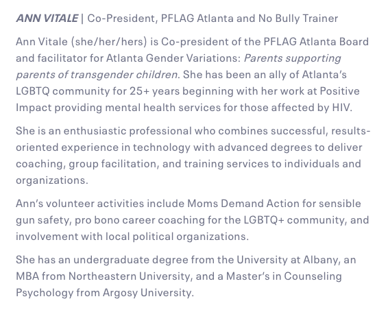 Ann Vitale is a No Bully trainer and PFLAG chapter president. She was keen for us to know that she had a 23 year old ‘transgender daughter’ and runs a support group for the same.
