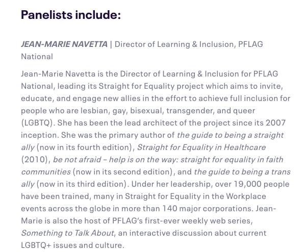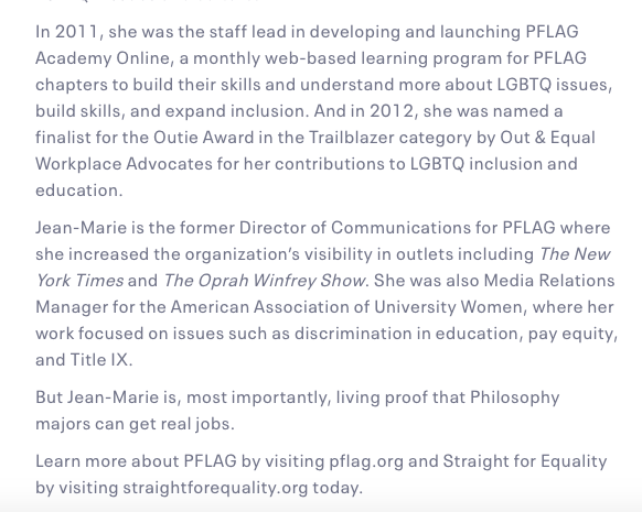 Jean Marie Navetta works for PFLAG, which is sort of an American equivalent to Stonewall UK. Hilariously she/her/hers is ‘living proof that Philosophy majors can get real jobs’. Her main strands of work at PFLAG appear to be on the subject of ‘allyship’.