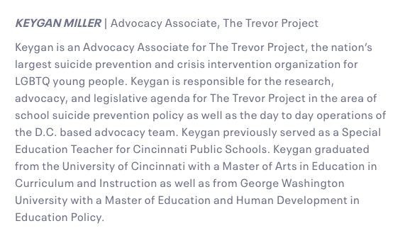 Miller – using someone’s pronouns can reduce suicide ideation. It’s so easy! Any adult has that ability! Go to schools and ask about their policies.