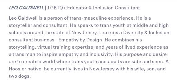 Leo Caldwell runs an LGBTQ+ training consultancy aimed at school kids, which appears not to be an established business since I could only find a link on Facebook and the business has had little in the way of interaction with other accounts. Interestingly one of the bonuses of the training offered is that it requires ‘little to no parental assistance’. Quel sorprise.