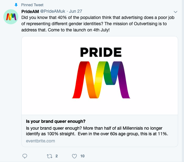 Pride AM had developed “Outvertising” as a free guide to encourage inclusivity, and to help brands reach a mainstream (i.e. straight) audience. Research suggested that “3 out of 4 tested LGBTQ themed ads outperform generic ads in driving brand recall” (except this can’t be true when it reaches saturation point).