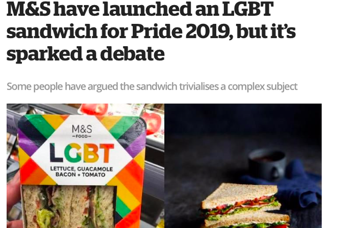 The LGBT M&S sandwich was mentioned (and kept being mentioned) as an inauthentic effort as M&S had not given much money to LGBT charities. (Beleaguered sandwich below)
