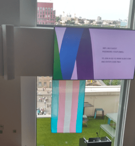 Some screens were on display in the reception area. Inside the lecture theatre a trans flag hung (no sign of the ordinary rainbow flag).