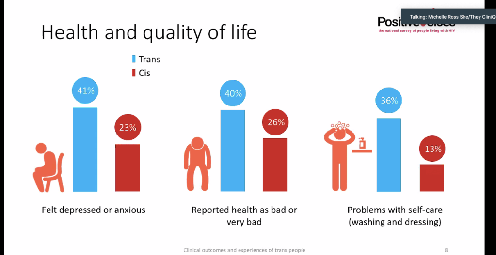 Erika talked a lot but didn’t have much to say that was of interest. Erika is HIV positive, doesn’t think that trans-identified males should be in the MSM category, not just because this affected PrEP uptake but also because of the gay thing, and that abnormal liver function tests as a result of the combined drug regime needed further data. (Ross said the nuance of this data needed to be ‘informed by trans people’.)