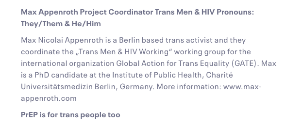 Max Appenroth (they/them) is also involved with GATE, as Project Co-ordinator for Trans Men and HIV. The group is made up of 23 female activists and researchers from 18 countries who all identify somewhere on the spectrum of gender identity from non-binary to transman.