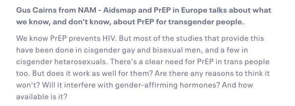 Last year CliniQ held a day long seminar, replete with a plethora of breakout workshops and full catering, on the topic of trans healthcare (see end of this article for my thread from last year*). It had been planned to have another day long event this year, but unfortunately the pandemic has put a stop to that. Instead we have had to make do with 90 minutes of shilling for HIV pharma instead.