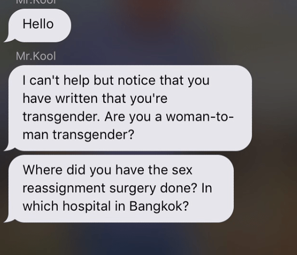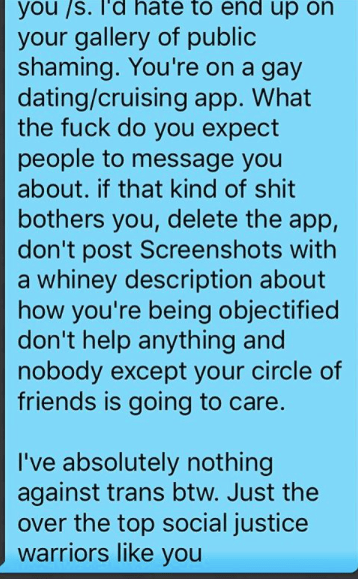 Appenroth told us on Instagram there is a hashtag #transmenongrindr, hinting there were horrors, so I went and had a look. Yeah sure, some of the messages aren’t nice, but given that Grindr is a sex app for gay men it could be so much worse. It’s notable that several are polite. It suggests that most gay men won’t allow themselves to be rude and aggressive when dealing with someone they perceive as female. The prim and proper responses of the women suggest that the rough and tumble of Grindr is just too much for them. It seems like people can’t really break out of their conditioning, even when their whole lives are based around non-conformity.