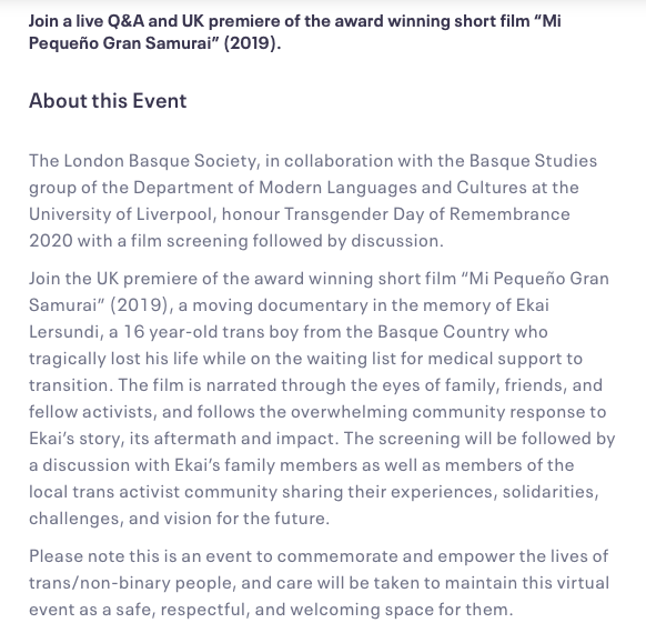 The University of Liverpool’s language department in conjunction with the London Basque Society hosted the short documentary film ‘Mi Pequeño Gran Samurai’ about a 16 year old trans boy who ‘tragically lost his life while on the waiting list for medical support to transition’. The occasion was the annual Trans Day of Remembrance (TDoR) when the whole world over gender identity activists promote stories of misery, murder and (in this case) suicide.