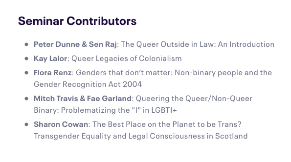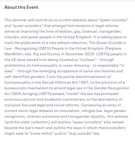 The panel was comprised of seven legal academics, including a dickhead sorry collaborator from the Future of Legal Gender project (later the same day Davina ‘thickie’ Cooper spoke at webinar held by another Law School, that I wrote about here – busy day). They had all written a chapter of the book ‘The Queer Outside in Law‘ (a snip at 85 Euros, or 25 per chapter) edited by Peter Dunne (Senior Lecturer, Bristol Law School) and Sen Raj (Lecturer, School of Law, Keele University).