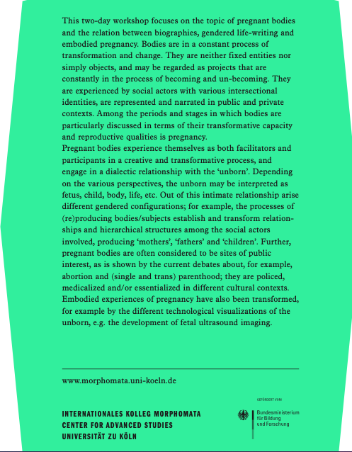 This two-day workshop focuses on the topic of pregnant bodies and the relation between biographies, gendered life-writing and embodied pregnancy. Bodies are in a constant process of transformation and change. They are neither fixed entities nor simply objects, and may be regarded as projects that are constantly in the process of becoming and un-becoming. They are experienced by social actors with various intersectional identities, are represented and narrated in public and private contexts. Among the periods and stages in which bodies are particularly discussed in terms of their transformative capacity and reproductive qualities is pregnancy.