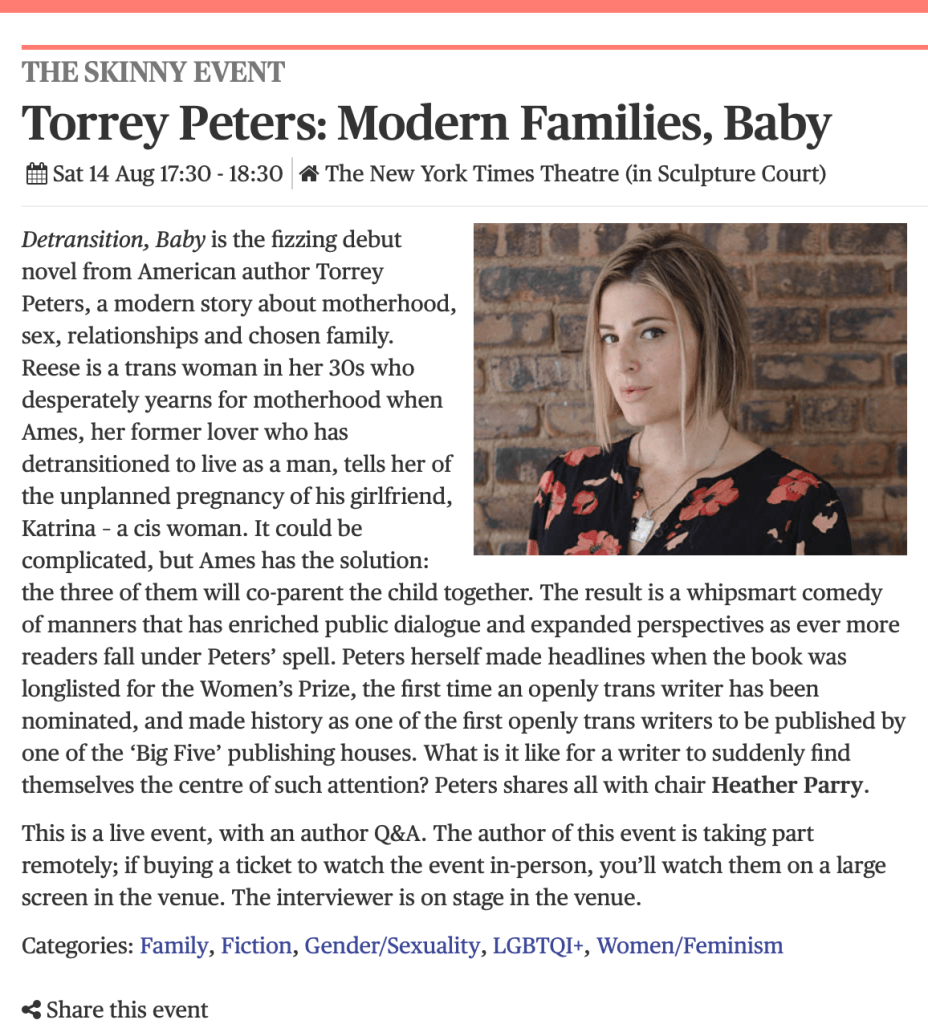 To think people actually paid to be in the audience to watch Torrey Peters on a screen is kind of mind boggling, but it’s true – about 60 of them by the look of things – held in a lecture hall at Edinburgh University. Another 70 or so watched live online, including yours truly. It was sponsored by The Skinny, which I thought was going to be some sort of oat milk high sugar ‘health’ drink, when actually it’s an ‘independent cultural journalism’ magazine. Never heard of it.