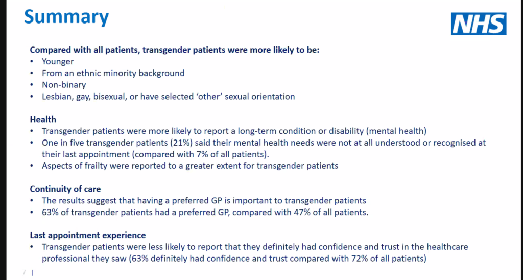 1. I was sent the 2021 GP Patient Survey and made a formal complaint about the gender ID question. I pointed out that they’d made it impossible to know who was which sex or even how many respondents actually considered themselves transgender as the separate questions were contradictory and self-cancelling. I got a useless, uncomprehending reply. It seems the NHS has rolled out this practice of refusing to ask straightforward Qs about biological sex. They can’t possibly even know how many trans-identified people responded as they totally screwed up collected such data.