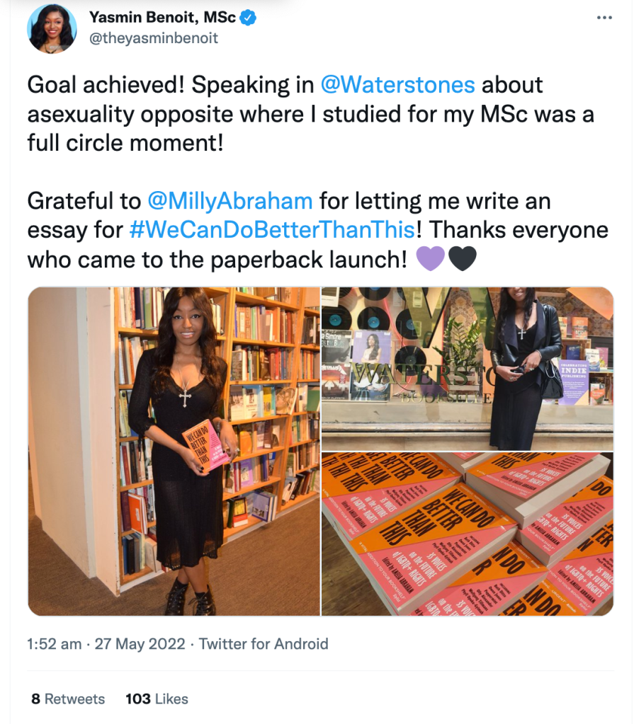 Yasmin Benoit is a model, aromantic-asexuality activist, speaker and writer from Berkshire, England. In 2018, she started the hashtag #ThisIsWhatAsexualLooksLike to improve asexual visibility.