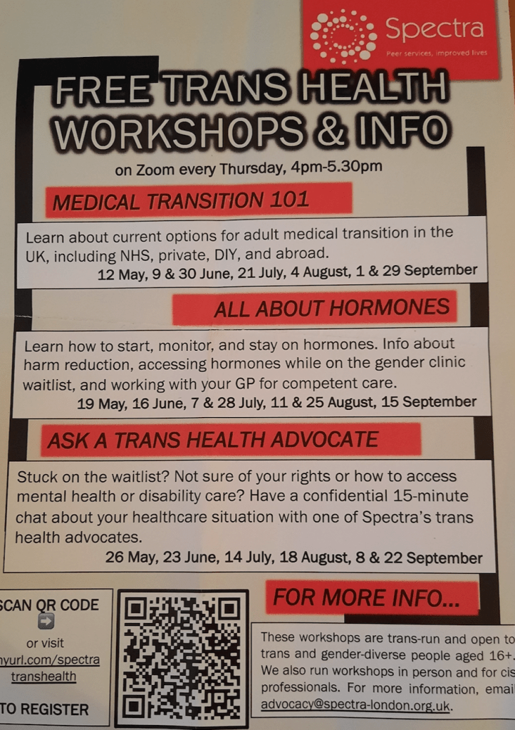 Secondly, as always, Shon and his journalist interviewer were unable to explore any of the issues at a deeper level because this movement just cannot tolerate even a tiny drop of reality. Like, what are they gonna do in a room full of people taking cross sex hormones – start discussing the detrimental effects it has on organ function? Or DVTs? I don’t think so. As I left the building, I picked up a leaflet, offering free advice on how to transition, funded by a real charity. Yeah.