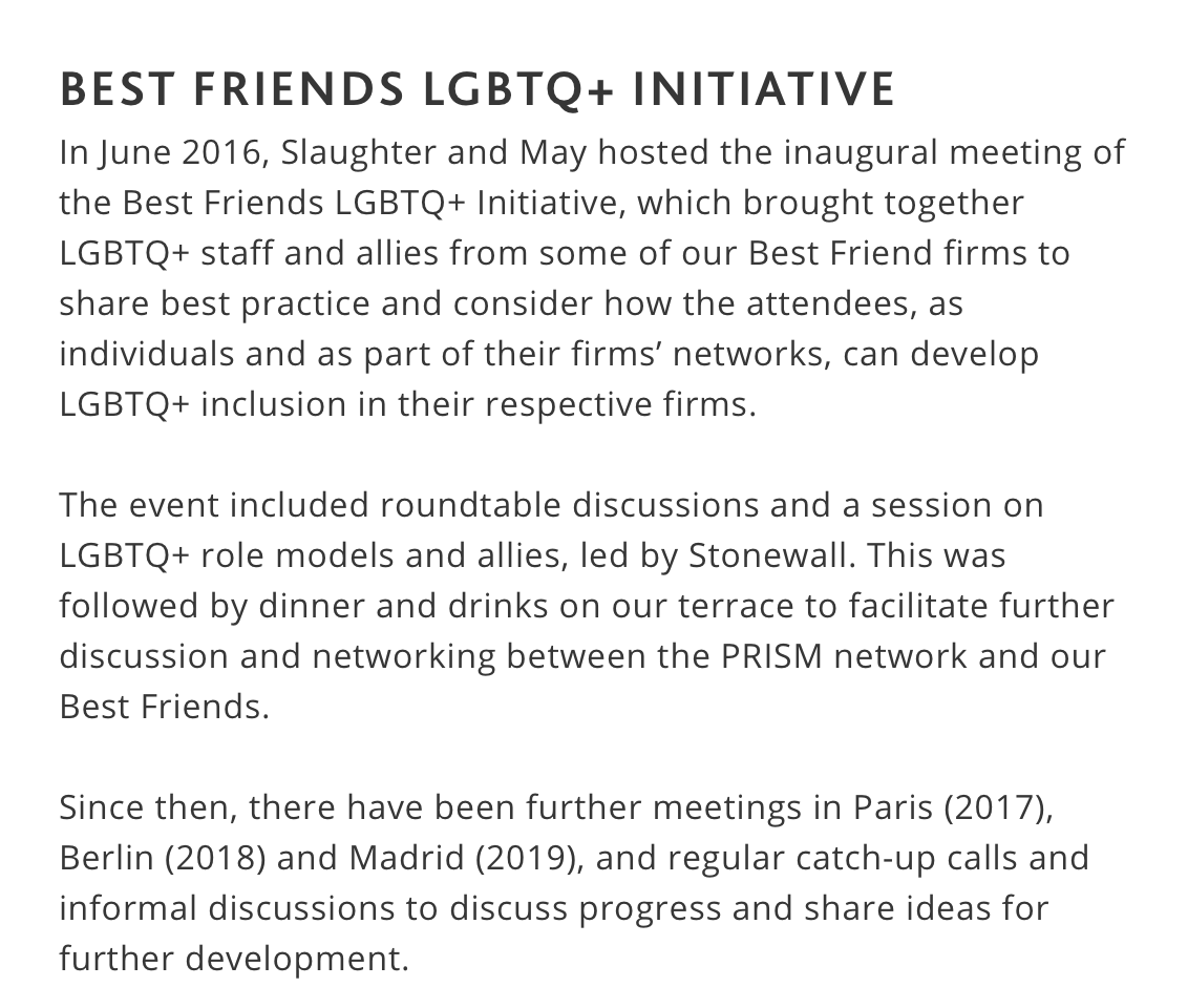 At the time of writing Slaughter and May had a direct link to their internal LGBT+ group PRISM on their external home page in deference to the now two month long Pride month celebrations. The Prism homepage had a high production values video in which a selection of hooray Henry’s and Henrietta’s hilariously hint at their marginalisation. You can read some of their profiles here – it’s notable that one of them is simply an ally and another has ‘loved people of different genders, and no gender’. According to the PRISM page, Slaughter is currently ranked 8th in Stonewall’s Top 100 Employer’s list. They also actively recruit LGBTQ trainees and offer mentorship, making identifying into the alphabet bag a shrewd move for anyone so-minded.