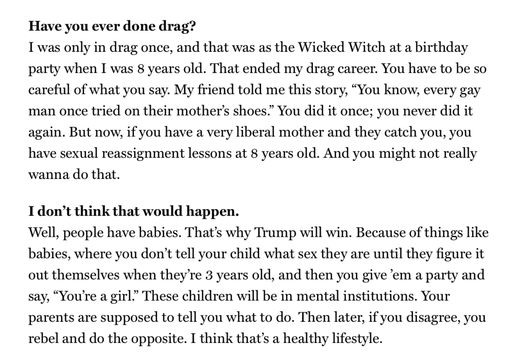 In a Vice interview he bemoans the stifling nature of ‘political correctness’ (which now feels like a completely out of date term) and alludes to the ‘fight’ in the gay world. What fight might that be? Well, similar to the NYT interview he doesn’t really explain and the interviewer doesn’t ask.