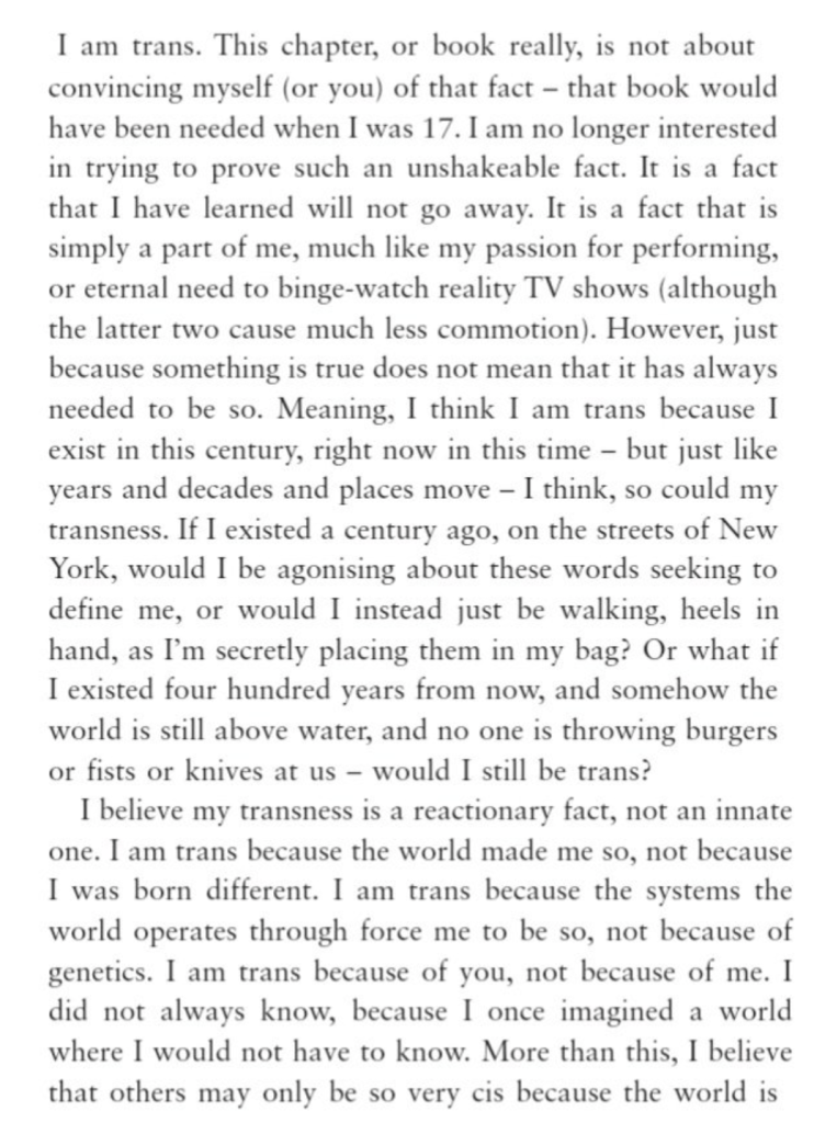 That’s the book’s first chapter title and Dabiri’s opening question. On the one hand, said Travis, things were better now, because there was now such a thing as trans non-fiction as a genre but this came with limitations and expectations. (The genre has been ongoing since Jan Morris’ Conundrum, so almost twice as long as Travis has been breathing air, actually.)