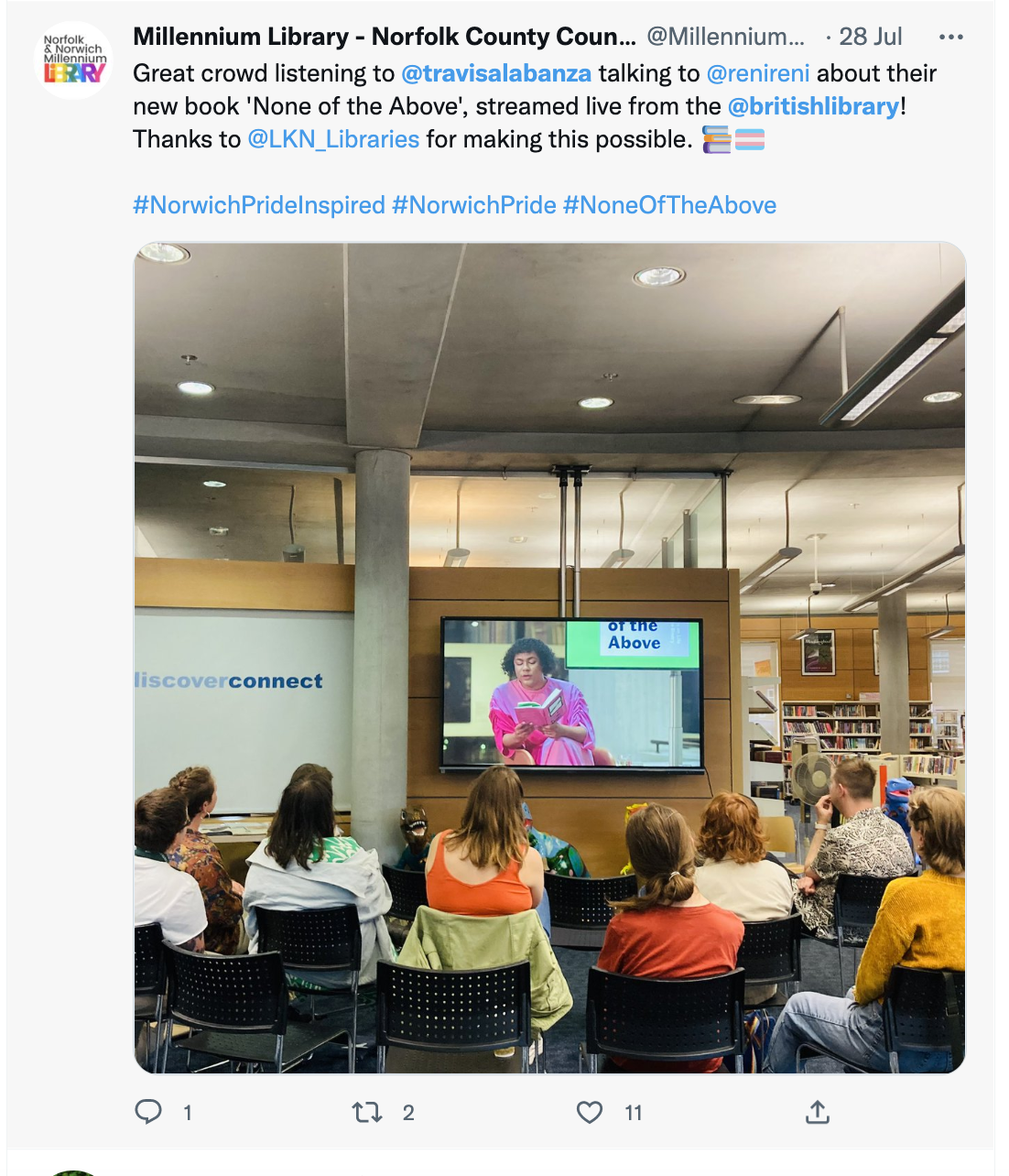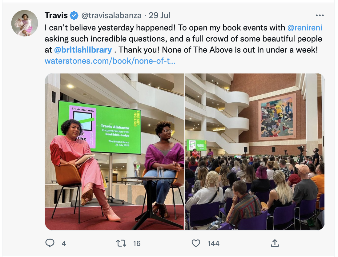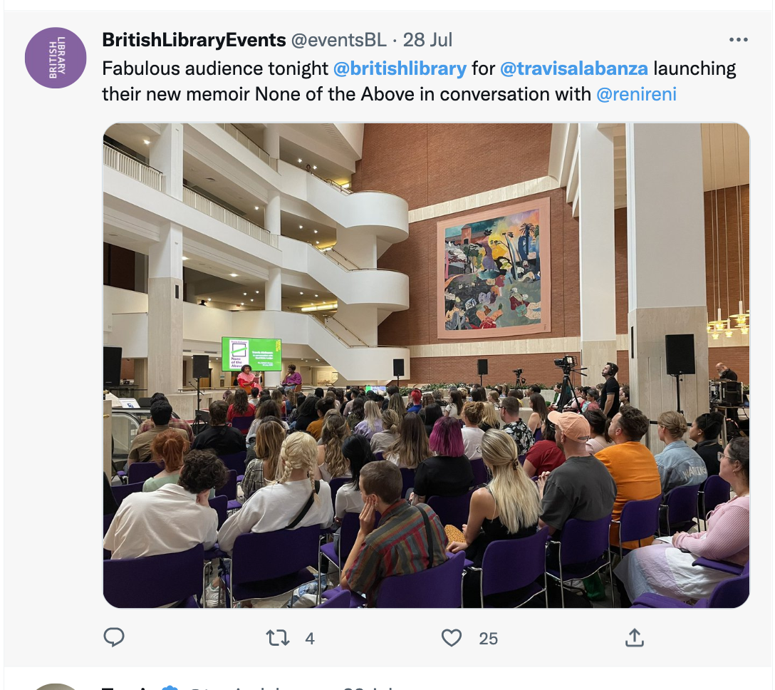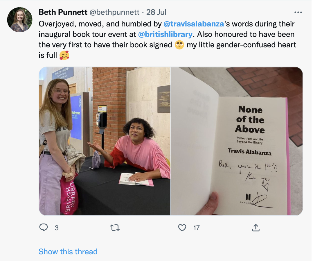 Travis’ first book event on the tour was supposed to be his super proud moment. It was held at the British Library and the event was protested with the terfs coming onto the stage and everything.