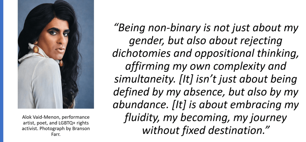 Gupta ended on the tantaliser of what ‘non-binary’ might mean in fifty years’ time, briefly imagining that future enbies would see it as a regressive term, she assured us that using ‘methodological assemblages’ would help decodify this complexity now and into the future.
