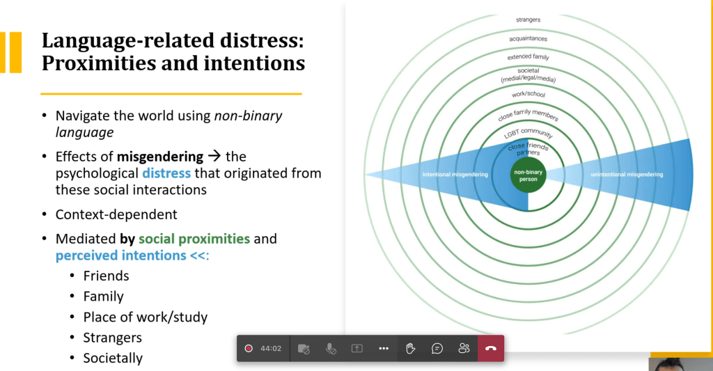 Cordoba used a fancy graphic to explain to us the amazing paradox that misgendering hurts the most when people you know do it on purpose but contradictorily when people you don’t know do it unintentionally it carries the same weight of offence. And vice versa. Notice how close friends and partners form the inner ring, then the LGBT community comes next, then close family members are third, etc.