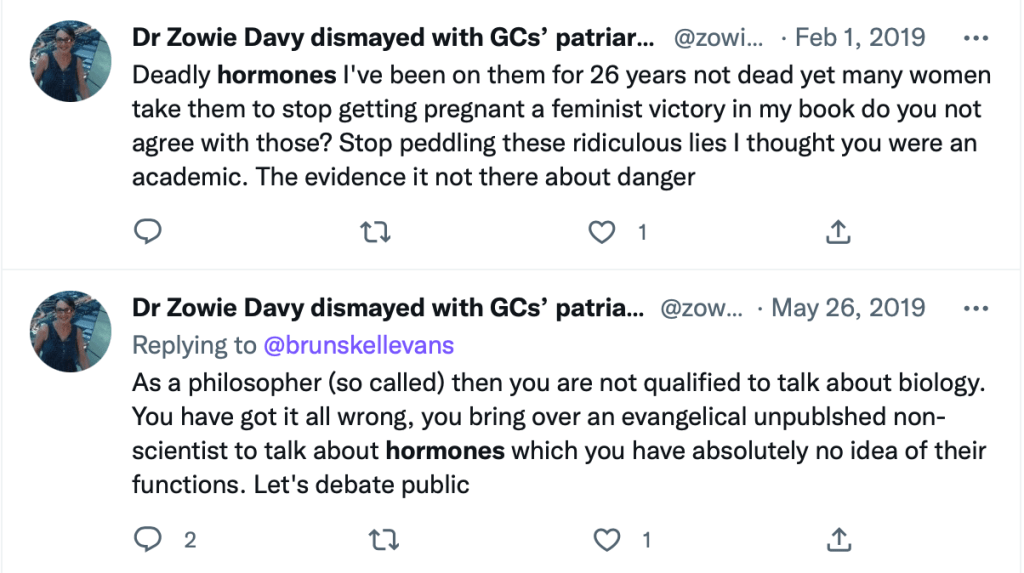 Then Davy then went onto claim that sex wasn’t real and that it was a racist colonial endeavour, the evils of cisheteronormative patriarchy, etc. Even ‘trans normative people’ got a barb for upholding ‘cis sexist tropes’, rather ironic when Davy goes to pains to be perceived as a woman, uses she/her pronouns and rather forget to mention to his audience that he was trans himself.