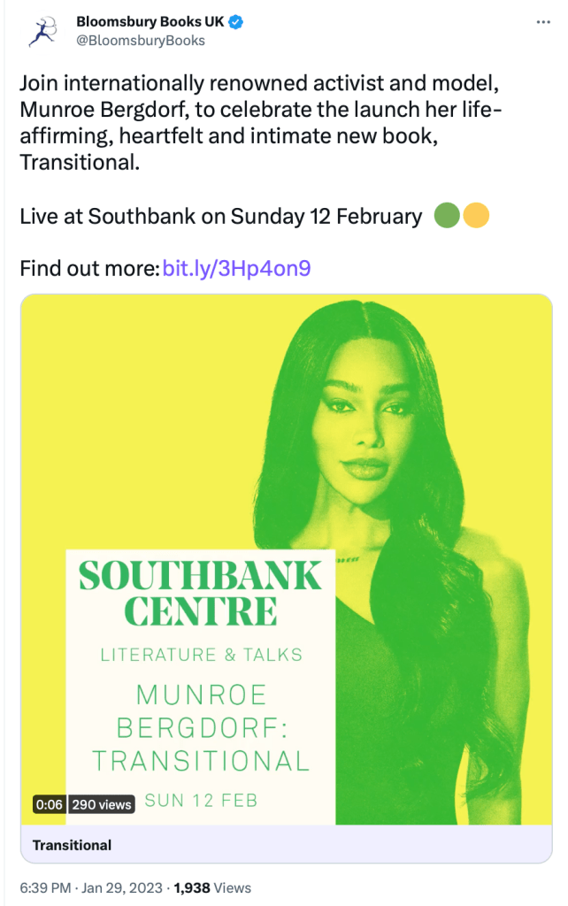 My personal theory about the delays in publication, admittedly backed up by nothing more than a cynical terfy hunch, and the fact that a book-length tract had already supposedly been written, is that Bergdorf ran into a number of disputes with a series of ghost writers commissioned to write the book. On eyeballing the book’s sample online it appears that memoir with strong political opinion thrown in, was the genre settled on finally.