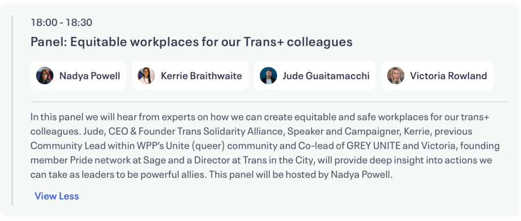 Braithwaite, had led ERGs (which stands for Employee Resource Groups, they implement DEI inside organisations). Ever the marketing dweeb, she had four key findings she wanted to share: 1) Allyship couldn’t be passive, you needed to think of it as a verb, and be proactively anti-transphobic, 2) Create a safer space for trans talent you want to attract, 3) Don’t then lean on the trans talent to then run your ERGs (McCann take note) and 4) No hot potato mentality!, i.e. don’t worry about saying something wrong, adopt a progression over perfection attitude (rather negated by points 1 and 3). Initially she had not felt safe joining ERGs, because of the fear of saying something wrong, but now she was proactively educating herself as an individual, that had melted away and she realised she was on her own learning journey. How anyone can say that with a straight face, I don’t know.