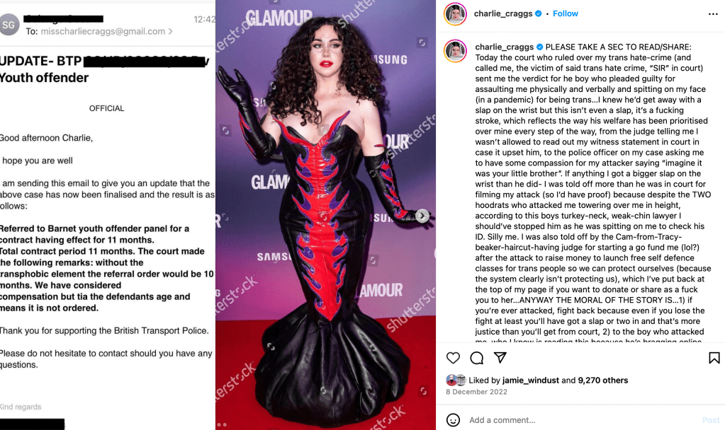 As an aside, Craggs claimed in a Pink News article, that after leaving YouTube’s premises, he was threatened by a group of men and posted a video one of the alleged ‘roadmen’ to Instagram. Below is that video, in which he pursues and goads a lone man, walking at speed away from him, intercut with stills of himself mocking the supposed aggressor.
