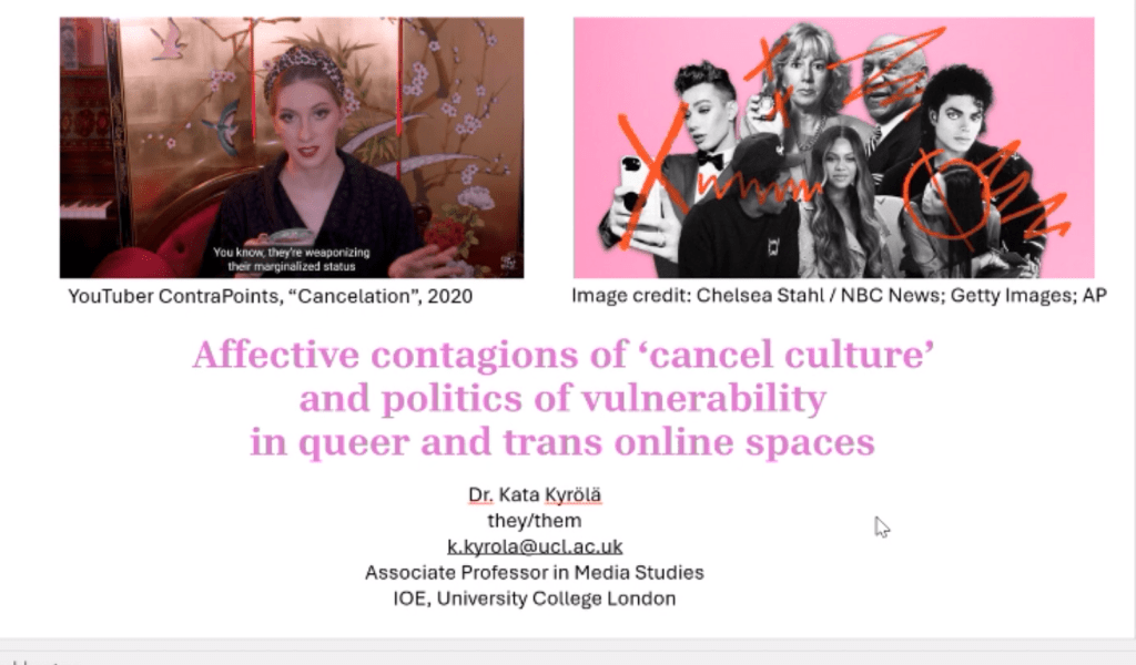 This talk will explore how notions of ‘cancel culture’ circulate online in relation to issues of sexual and gender diversity, and how conflicts around ‘cancelation’ speak to broader cultural-affective tendencies, theorised through politics of vulnerability, paranoid reading, and platform drama.