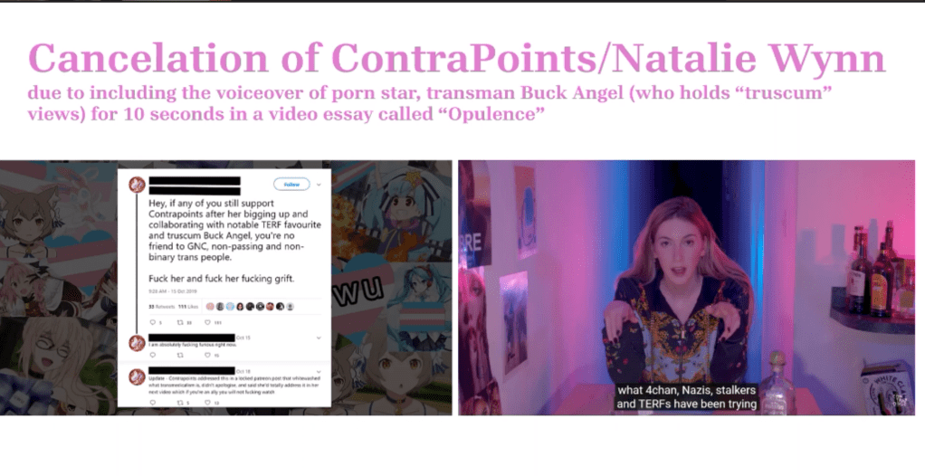 [Natalie Wynn] was the subject of a cancellation campaign herself in 2019, when she became the target of a wave of harassment after her video Opulence, which attacks consumer culture and our obsession with wealth, used a voice-over from Buck Angel, a transsexual porn star who had in the past made statements considered offensive by some in the transgender and non-binary communities.