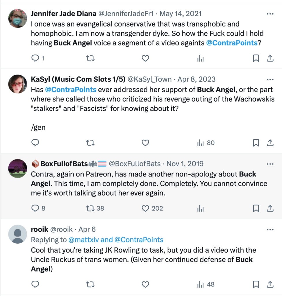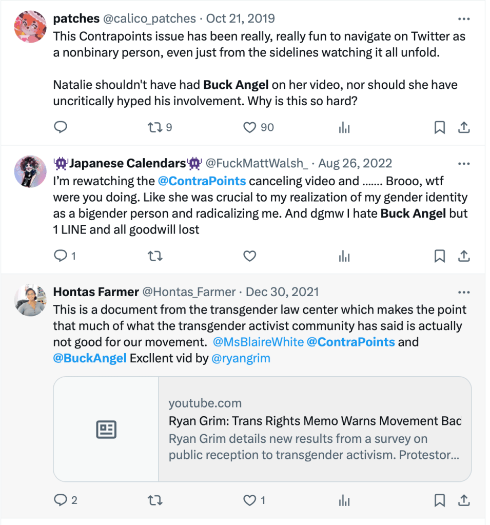 Trans-identified twitter users apparently savagely attacked ContraPoints, so we went looking for the tweets. The condemnation we could see was mostly mild, some even complimentary, and not exactly huge amounts. Having said that, we are on the terfblocker so it may well be we can’t see the full extent. According to what we could view though, it was quite notable it appeared that no famous accounts had attacked Wynn/ContraPoints.