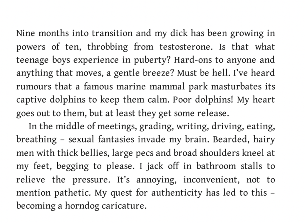 Other than the typical want wanting-and-eating-cake syndrome on display, the most obvious reading of her personal history would be that she was so conflicted by her lesbianism that she could only allow herself those experiences via the facsimile of a male-ego and -body. Also, would she have transitioned if she had rocked up Chicago, rather than San Francisco? It seems Ben-Zeev didn’t ask herself these questions whilst writing about her confusing past.