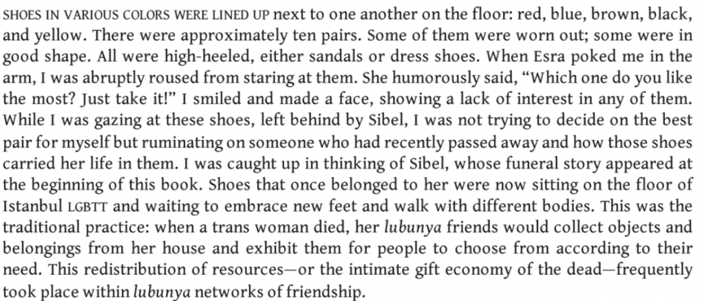 Zengin felt this chapter in her book best demonstrated how the relationship between violence and intimacies worked. In the only interesting part of the lecture, we learnt that many trans (and thereby homosexual or any other type of transgressor) could not be buried on consecrated grounds or be washed, according to Islamic practice. There were few Muslim clerics who would be prepared to officiate and many families would either abandon or (I guess) not even both trying, which is understandable when ultimately a large payment would likely be the main motivating factor for a cleric to agree. However, in Zengin’s hands the issue was merely a chance to political point score and she seemed generally unbothered by such restrictions being exerting over people in general.