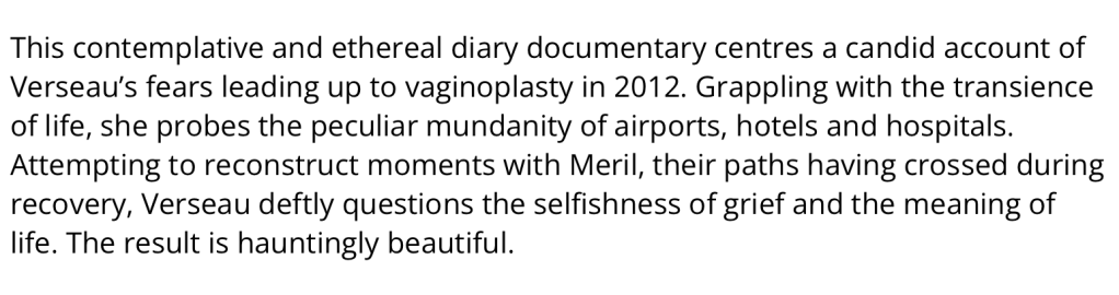 During the Q&A it appears that Verseau has very much survived the trauma and had a fuck-ton of female feminisation surgery since, now fully passing, so -yay!- success(?). As per usual no one asked any obvious questions, e.g. Do you regret it? Did your two stooges go through with it? Why didn’t the third lad return to end the film? And: Why didn’t you put this highly relevant information in the film? These are all questions people would have asked had it been any other issue film.