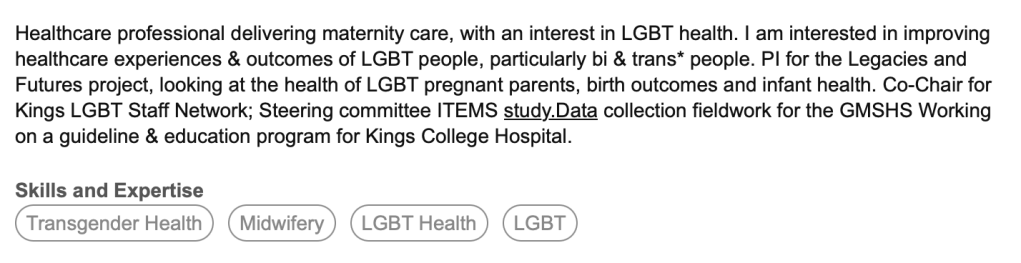 During the pandemic, Hinton, for the lack of anything better to do, did lots of research into LGBT healthcare and was particularly horrified by the situation for trans and non-binary people. The discrimination was just so blindingly obvious! Hinton set about putting something in place at King’s College Hospital using its LGBT staff network, which she co-chairs. ‘Higher ups’ weren’t that keen but then suddenly were and showed something to Hinton they thought workable, but Hinton told them ‘actually it was not fine’ and that they had to wait for her to create something ‘good’. Hinton went away and furiously wrote, talking to a lot of people, including friends, which included friends who had lived experienced of trans healthcare. She also reviewed other trans inclusion NHS Trust guidance. She believes the one she wrote is the ‘best one out there’. It was a Trust wide guideline, said Hinton, which ended up being two separate things; one for staff, on how staff should treat patients and how patients should be treated, and the other … well, we didn’t learn, though it made it sound like the staff policy was secret (certainly no web searches bought the document up). Hinton was glad it was in place because it would need to be ‘deliberately dismantled if it were to be ignored.’ The policy covered the whole gamut of healthcare, including emergency admissions through A&E, pregnancy (e.g. ‘the challenges of providing blood to someone with childbearing potential’). The latter led to her being invited to a blood transfusions conference, where there was a ‘very complicated but open discussion about it’ (aka as people politely biting their tongues whilst sarcastically explaining it was a stupid idea).