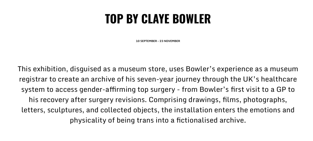Bowler said that Top isn’t personal or intimate. ‘Really?,’ Garrod responded. ‘What is it, if it’s not personal or intimate?’ Bowler couldn’t answer, so Garrod offered an answer; the work had been made in a dissociative state, therefore Bowler had not really been present in it. Which isn’t a half-bad answer but then doesn’t explain why Bowler agreed to it being billed as ‘his seven year journey’ (blurb she likely wrote herself), rather than, say, ‘an exploration of not really being embodied.’ Garrod continued, talking of the ‘liminal space’, which was the waiting list in the NHS for GIC care, in which trans people became non-existent. ‘I’m not actually in it,’ (meaning the exhibition) claimed Bowler, to which Garrod could only respond with a sceptical murmur, unsure of where to go next. Bowler continued to whisper an explanation, which probably only Garrod could hear.