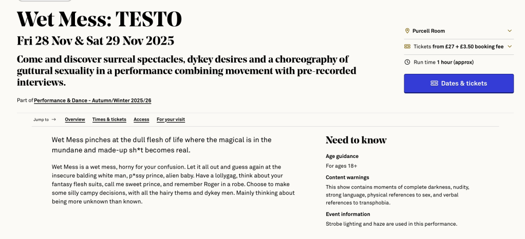 Interestingly, the blurb below for TESTO misses out the fact that it’s about the trans-identified female experience of taking exogenous testosterone. Now, why would the Southbank do that? At least it had an age-guidance of 18+ though.