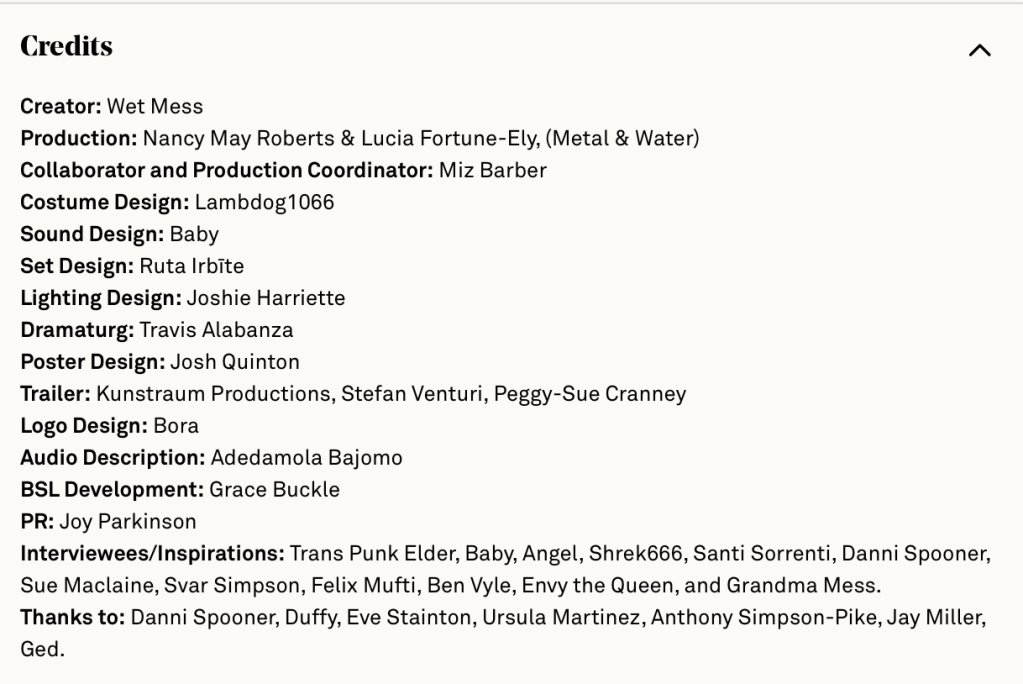 Although there were real flashes of brilliance when Wet Mess got round to some dancing, on the whole, the performance was too slow, too self-involved and – crucially – lacking in any internal logic. (Further proof that Travis really was responsible for the dramaturg.) For example, how can anyone buy into an underlying theme of gender dysphoria, needing to be fixed by testosterone, when the performer does split beavers with queer abandon? I mean, I get it, Wet Mess wanted to be a wet mess, but zealously flashing us her beaver had the unfortunate effect of reminding us so much of ‘gender dysphoria’ is performative bullshit.