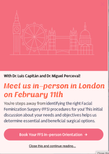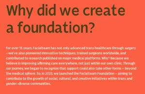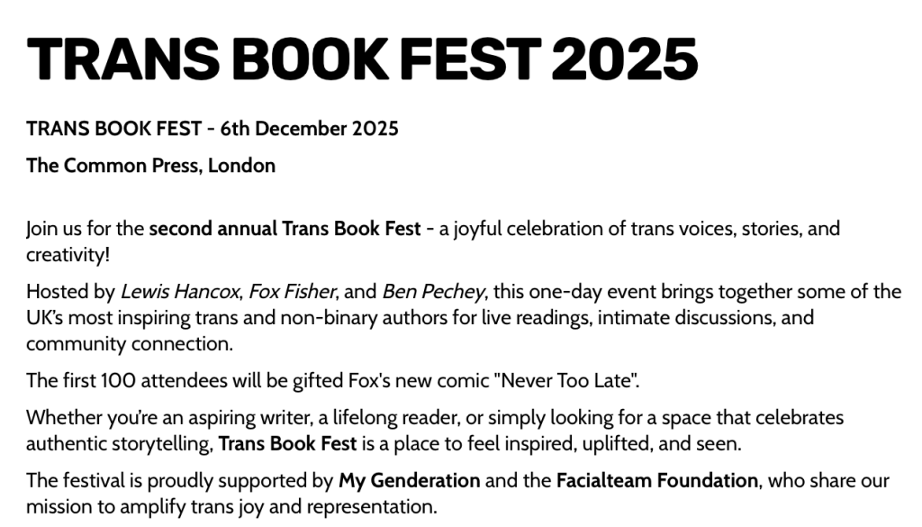 The other sponsor was Facialteam Foundation, which funds arts projects led by trans-identified people, including one called ‘Here to Pee’. Inspirational. I note they have previously helped My Genderation. The plastic surgeons behind Facialteam Foundation, specialise in facial feminisation surgery (FFS for short). Whilst visiting Facialteam, its business website, an advert popped up – the team would be in London soon (February 2026). Hence the logic in them getting involved with the Trans Book Fest held in early December 2025, I guess.