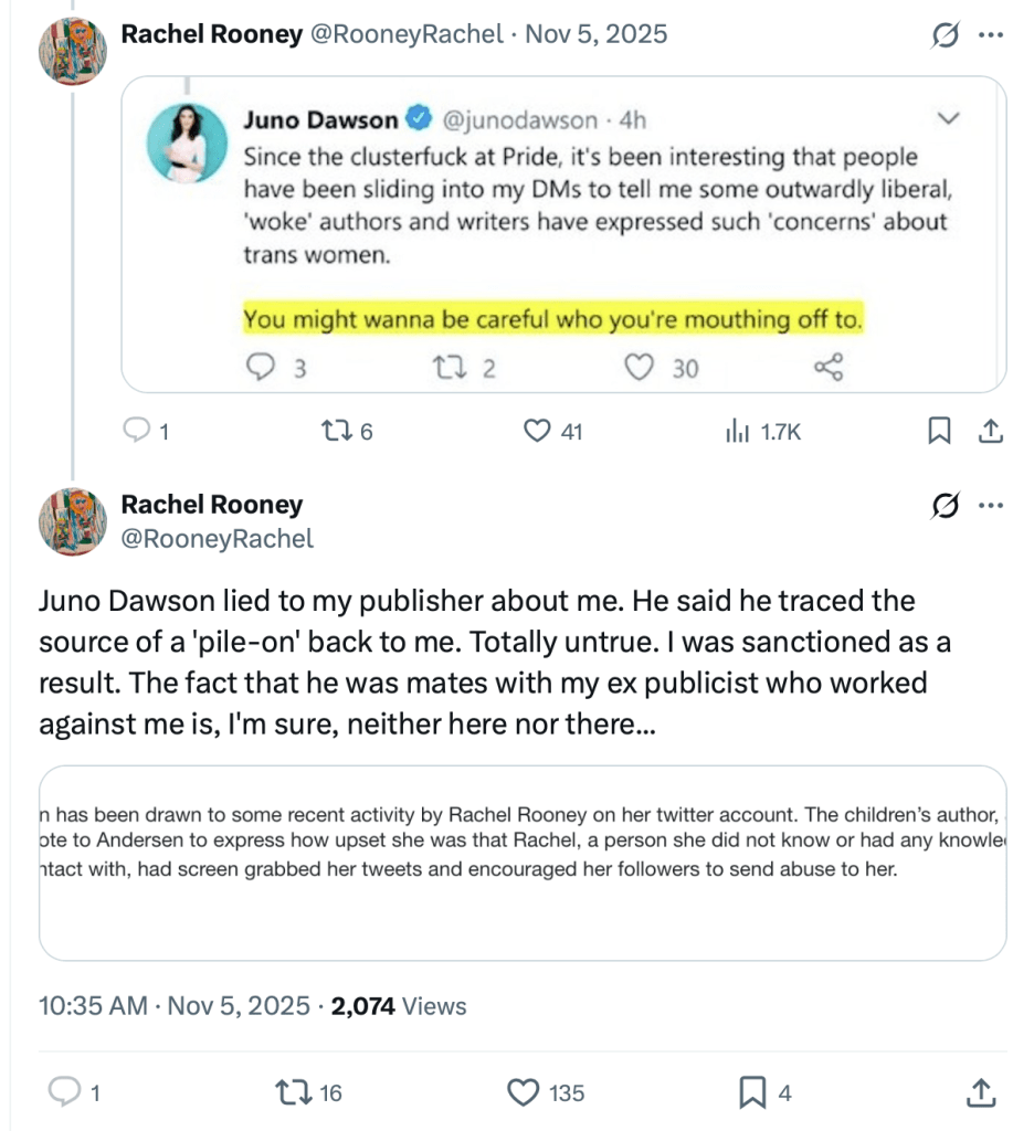 In the very next breath, Dawson urged publishers to engage with fandom on social media. I mean, the guy was all over the place and had been speaking way too long. Almost an hour in fact, meaning, of course, that there would be no time for Q&A. I predicted that ahead of time, these people never want to do Q&A with terfs lurking. In particular, he did not want any questions about his on-the-record support for Mermaids or his bullying of fellow children’s author Rachel Rooney. So he ran down the clock instead.