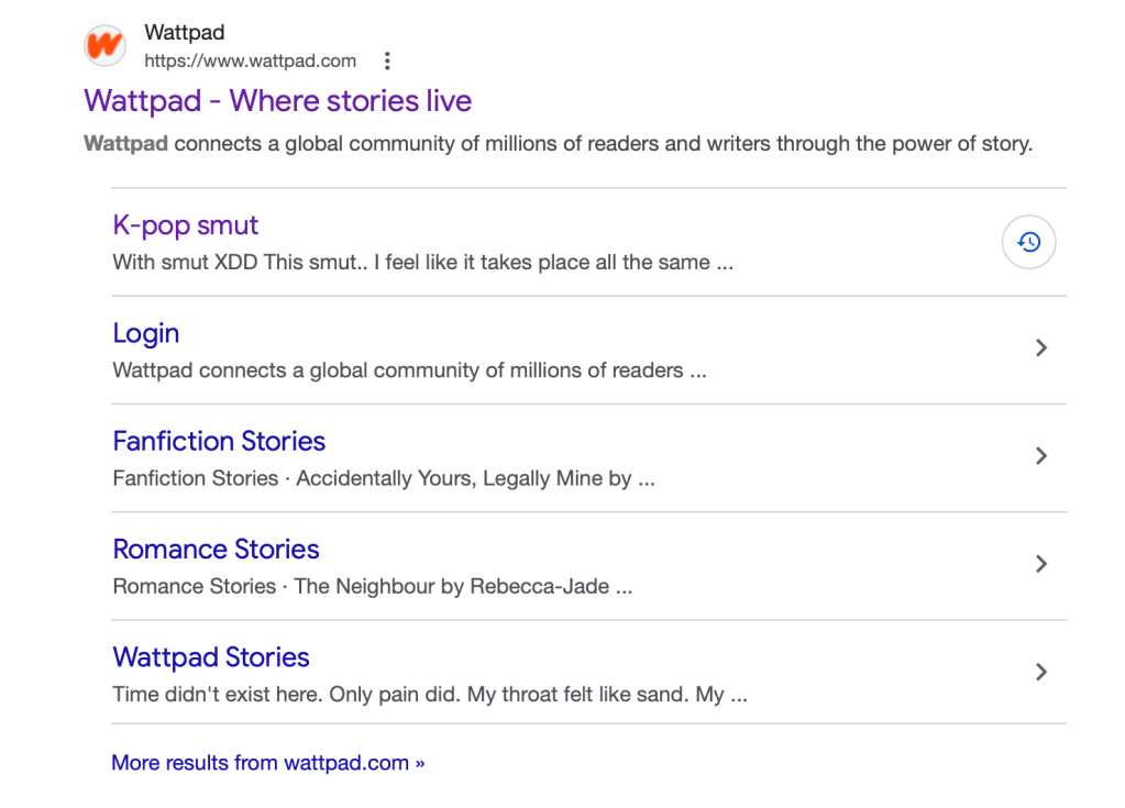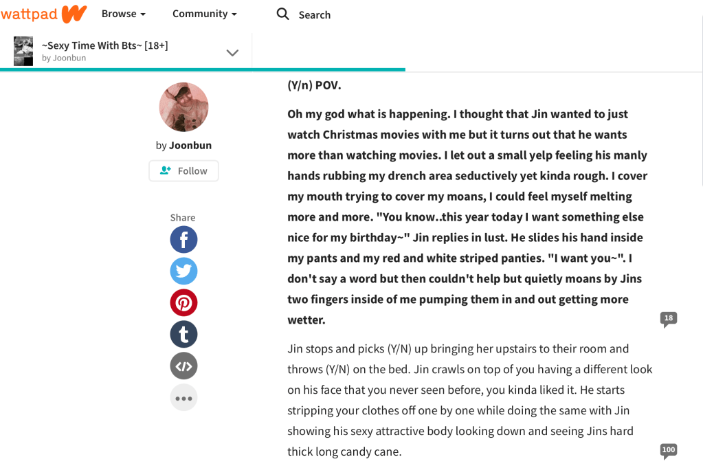 All reading was good reading, according to Dawson now, and gave a shout-out to a site I’d never heard of before – Wattpad (which appears to be the kind of place you’d find AI generated pap). In fact, he was most specific, according to him ‘horny Wattpad k pop fan fiction’ is reading. So, as one does, I put that into Mr Google and the story below right, came up at the top of the list: